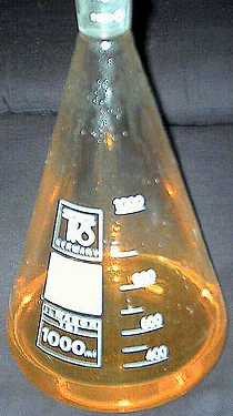 The oil was dissolved under stirring in 300mL GAA, and the flask placed in an ice-H2O bath. A solution of 53.3mL [166.2g; 1.04mol] Br2 in 300mL GAA was added under stirring in one portion, and a reflux column was quickly attached. After ~1min the flask was removed from the ice-H2O bath and the rxn mixture left to stir at room temp. The flask became warm, and after approx. 6min spontaneously crystallised to a pale yellow-orange unstirrable mass [Fig. 2 (left)].