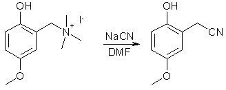 Place 200 ml of 40% NaCN soln (d=1.4) in flask, (equipped with addition funnel, mechanic stirrer and 50-cm glass tube as air condenser) and add 300 ml of DMF. Dissolve 200 g (0.62 mole) of quat. salt in 200 ml of DMF, and place this soln in addition funnel. Heat about 80-90°C and at this temp drop by drop add soln of quat. salt to DMF suspension of cyanide (last not completely dissolved). Do it under good fume hood during 30-40 min. Strong evolution of trimethylamine observed. When addition complete, stir another 1 hour at 80-90°C. After cooling homogeneous dark reaction mixture poured in 2 L of water and extract with 4-5 150 ml portions of chloroform (or methylene chloride). Pooled extract was washed once with brine and quickly dried by shaken with anhydrous Na2SO4. Chloroform was distilled off under water pump vacuum; and then was distilled off DMF, taken by chloroform extraction. The residue crystallizes upon cooling, 62-65 g of 2-hydroxy-5-methoxybenzyl-cyanide (62%). Used as such for the next step. With hindered phenols as 2,6-dimethoxyphenol and 2,6-dimethylphenol cyanide, exchange of the quaternized mannich base succesfully runs in water. In this case (with the p-methoxyphenol derivative) using aqueous cyanide lead to massive charring, thus DMF was used. DMSO would probably also work. 2,5-Dimethoxy-benzylcyanide