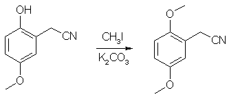 65 g (0.386 mole) of the previously obtained benzylcyanide, 400ml acetone and 100g of finely powdered K2CO3 was placed in RB flask equipped with an addition funnel, stirrer and reflux condenser). As PTC catalyst added 10 ml PEG-400 (polyethyleneglycol). To this mixture added 50 ml of methyl iodide drop by drop during 1h and mixture refluxed 14h with stirring. Initial dark color changes to light yellow; after cooling the solid salts was filtered off, washed with fresh acetone, to acetone 50ml water added and solvent removed in vacuo. Residue was extracted with CH2Cl2, extract dryed with Na2SO4, and solvent removed, resulting in 62 g of 2,5-diMeO-benzylcyanide, 91% yield (bp 115°C at 2mmHg, mp 53-55°C, white needles from IPA). 2,5-Dimethoxyphenylethylamine (2C-H)