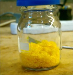 When the solution had cooled down to to 60?C it was decanted into a beaker for quicker cooling this left a lot of smoke in the RBF, after adding some H2O to the RBF the smoke cleared up and caused formation of some residue yellow crystals.