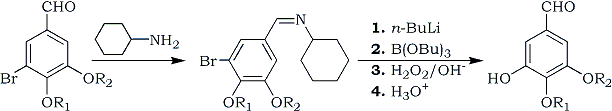 In our initial work, small quantities of 1 were prepared using the method of Jacob and Shulgin2a which is shown in Scheme 1. Their synthetic route involved 6 steps starting from vanillin (2) with an overall yield of 51%. This route involved protecting the aldehyde group as its cyclohexylimine (3), which was purified by vacuum distillation. The purified imine was then converted to 1 in four steps using a one-pot sequence. The protected bromovanillin, 3, was lithiated with butyllithium and immediately treated with tributyl borate. After warming to room temperature, the borate intermediate was reacted with 30% hydrogen peroxide and then quenched into dilute acid to give 1. Evaluation of this method identified several potential problems for scale-up. The imine 3 is very high boiling requiring very good vacuum (<1 mmHg). A low temperature system is required for the lithiation and boronation, which are done at -78°C. Finally, the peroxide reaction is quite exothermic and probably difficult to handle on large scale. With these considerations in mind we started looking for alternate routes to 1.