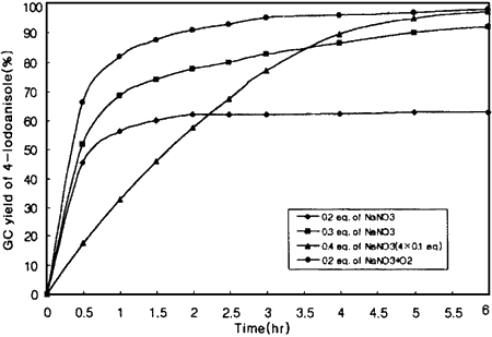 The novel iodination with I2/NO3- performed under a deoxygenated argon atmosphere reveals that 0.4 equivalent of nitrate is the least amount required for the quantitative iodination of anisole (Figure 1). On the other hand, 0.2 equivalent or less of nitrate is enough for the complete iodination if oxygen is bubbled through the reaction mixture. These results can be explained by the following equation5 which shows the formation of 3 equivalents of reactive I+ based on the quantity of nitrate used.