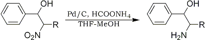 The stereoselective synthesis of β-amino alcohols is of considerable interest in organic synthesis as β-amino alcohols constitute useful synthons to many important heterocycles. Ammonium formate in THF-MeOH solvent in presence of 10% palladium on charcoal efficiently reduces β-nitro alcohols to the corresponding β-amino alcohols at room temperature in high yields2. The reactions are stereospecific and proceed with retention of configuration. Thus, syn-nitro alcohols 1a and 1b are converted to syn-amino alcohols 2a and 2b.