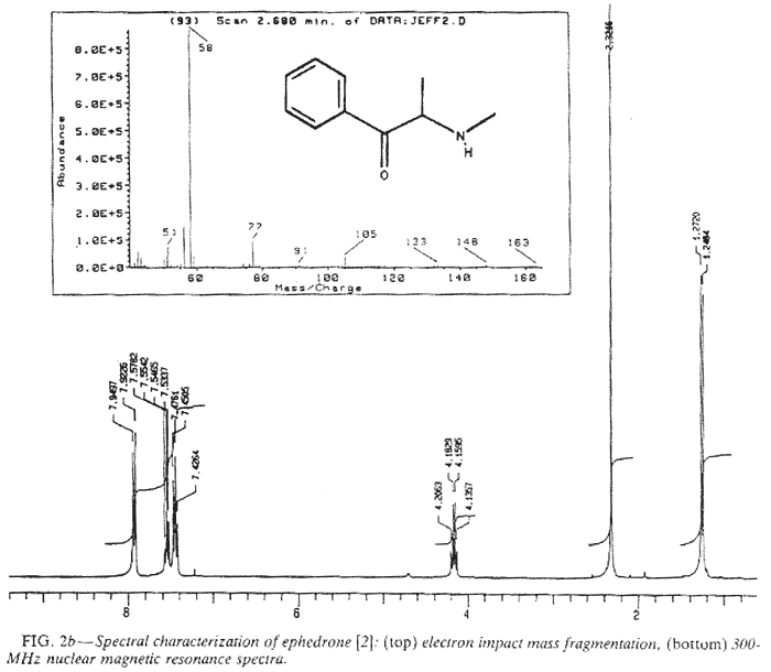 The infrared data (see Fig. 2) substantiates the secondary amine hydrochloride moiety (2937, 2696, and 2461 cm-1), which is unchanged when ephedrine is changed to ephedrone. Furthermore, the absence of an amide carbonyl stretching eliminates the possibility of N-formyl oxidative formation, as is typical of some amine-permanganate oxidations, such as those for cocaine11 and other amines12,13. The carbonyl stretching frequency at 1700 cm-1 argues for the presence of a benzoyl ketone. This is confirmed splitting of the aromatic proton resonances in the hydrogen (1H) NMR, which is typical of an orthogonal carbonyl with the aromatic ring (see Fig. 2a). The carbon-13 (13C) NMR data show good correlation between the experimental and calculated chemical shifts14 (see Table 1a). At the same time, the mass spectral data confirm the nominal mass (C10H13NO = 163), and the amine driven beta bond cleavage is exhibited in the m/z 58 ion (see Fig. 2b, top spectrum).