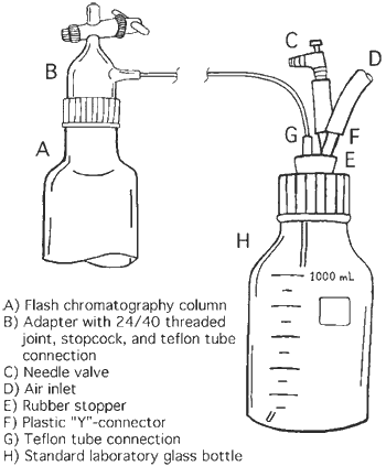 The sample is applied on top of the column and the adapter is fastened while leaving the stopcock open. The preferred solvent mixture is added to the bottle and a slight pressure is applied, forcing the solvent mixture into the column. The rate of solvent addition is adjusted so as not to disturb the silica bed. The stopcock is closed when the column is filled to an appropriate level and the pressure is adjusted, using the needle valve, to give a suitable flow of the eluent. The solvent can easily be changed or replenished during the separation by simply changing bottles. When the separation is completed the bottle is removed and only a small amount of solvent, left in the adapter, is wasted. We have used this methodology for hundreds of separations and found it to be safe and reliable. It is also convenient to store different solvent mixtures in bottles ready to use, avoiding unsafe solvent handling.