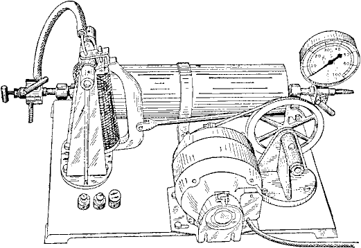 Catalytic Hydrogenation Apparatusfrom Organic Syntheses, CV 1, 61[ Back to the Chemistry Archive ] 1. Procedure(A) Apparatus. A Prest-o-lite tank A from which the filling has been removed (Note 1), or any other similar tank of about 8- to 10-l. capacity, may be conveniently used as a container for hydrogen. The top of the tank contains two openings B and C. In B is welded a tube holding a gauge and valve, and through this tube the hydrogen from a large cylinder D is introduced into the tank. In C is welded another tube controlled by a needle valve. E is used for the vacuum, a manometer G being introduced into this system, and F for a tube leading to the reaction bottle H. These outlets are so arranged that it is possible to shut off the tank from either outlet and also to make a direct connection between the vacuum and the bottle H, leaving tank A out of the circuit. The connection between the tank A and the bottle H is a heavy taped rubber tube (Note 2) which is in turn connected to a glass tube inserted through the stopper of the bottle. The rubber tube and stopper should be of high grade and must be carefully boiled with alkali before being used (Note 3). The arrangement for shaking the bottle is shown in the diagram (Note 4). The driving pulley is connected to the reaction bottle by a wooden or preferably a metal rod. The rod in turn is attached by a yoke to a metal ring which circles the bottom of the bottle. The ring opens on the back side of the bottle and is held together by a wing-nut and bolt. In order to hold the stopper in the bottle when the latter is filled with hydrogen under pressure, a metal strip I is clamped tightly over the stopper. This strip is screwed to the long wooden bottle holder which extends between the bearings, and a short wooden piece which fits around the neck of the bottle is attached to the longer one by means of screws held by wingnuts. This arrangement permits removal of the bottle from the apparatus without detaching the metal strip.