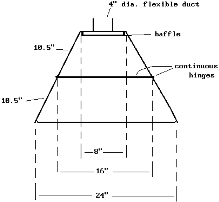The design is illustrated in Figures 1–4. The hood has a truncated triangular footprint with the duct attached to the center of the truncation. This duct is a removable flexible hose2 4 in. in diameter and about 3 ft long. It fits into a connection (in our case, a plastic gate valve3 obtainable from building suppliers, but any slip-fit connection would work) on the bench surface for connection to an appropriate exhaust duct below the bench. This eliminates unsightly overhead hose ducts, although this hood design could be used with an overhead exhaust in a facility without under-bench exhausts. The ends of the duct are attached to metal duct fittings that mate via a slot-and-pin arrangement with another fitting on the hood in the one case, or fit into the connection to the exhaust system in the other. The hood was designed for an exhaust system that would provide a face velocity of 80 ft/min at the larger opening. This value was considered by our risk management and HVAC professionals to be an appropriate level for safety4. (It is important to have input from qualified HVAC personnel to establish appropriate design of the exhaust system, since this determines the hood performance.)