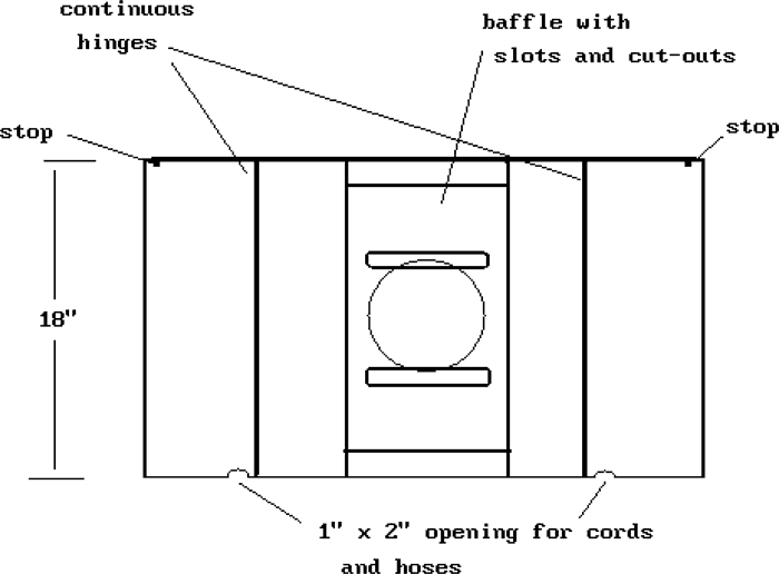 Folding sides and top (there is no bottom) permit the hood and its duct hose to be stored in a standard 18-inch-wide laboratory cabinet. Continuous (piano-style) hinges are used for rigidity. The hood can be used with sides and top folded back, providing excellent draw (in excess of 100 ft/min) for small apparatus, or with the top and sides opened to provide a comfortable working area at the design air flow. With the sides and top folded, the unit occupies only slightly more than one square foot of bench surface. In the open position, stops on the top prevent the sides from being inadvertently moved. Small slots are provided in the bottom of the movable sides to bring in power cords or hoses without cluttering the front opening.