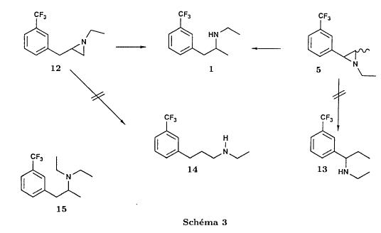 7.40-7.70 (m, 4H). * Method using triethyl phosphite Triethylamine (208 mg; 1 eq), tetrachloromethane (316 mg; 1 eq) and triethylphosphite (0.49 ml; 1.15 eq) are added to the aminoalcohol 9 (508 mg; 2.05 mmol) in acetonitrile (2 ml). The reaction is heated to 45°C for 5h20. After cooling, first 1N hydrochloric acid (10 ml) then ether (20 ml) are added. The phases are separated and the aqueous phase is washed with ether (2 x 20 ml). It is basified with 10N sodium hydroxide (2 ml) and reextracted with ether (2 x 20ml). The two etherical phases are combined, washed with water, dried over magnesium sulfate, filtered and evaporated. The aziridine 12 (341 mg; 73% yield; GC about 80%) is thus obtained. - 1-Ethyl-2-methyl-3-[3-(trifluoromethyl)phenyl]aziridine 5 We proceeded in the same way as for the aziridine with the triphenylphosphine route. Aziridine 5trans: Reacting the
