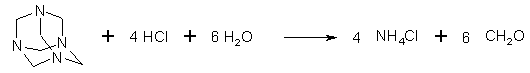 Figure 1: Hexamethylenetetramine (Hexamine) is hydrolyzed by HCl to ammonium chloride and formaldehyde When HCl is added to a solution of HMTA (Hexamine), it is hydrolyzed to NH4Cl and CH2O. If formalin and ammonium chloride is used directly, instead of HMTA, the solution also contains around 10% methanol as a stabilizer for the formalin, and this reacts with the formaldehyde, creating the acetal methylal, HC(OCH3)2, which has a low boiling point (42-43°C), and will distill off during the heating. As seen below, formic acid is also formed in the reaction, which also reacts with methanol, forming methyl formate, also with a low boiling point.