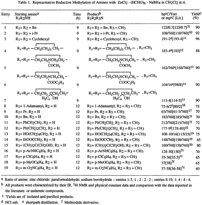 Reductive amination1,2 of aldehydes and ketones that allows a direct path from carbonyl compounds to amines is a fundamental reaction in synthetic organic chemistry. Among the hydride reagents, sodium cyanoborohydride3 has been widely employed to effect this transformation in recent years. The other reagents include sodium borohydride in neat liquid carboxylic acid media4 or in aqueous sulphuric acid5, However, the presence of acid-sensitive and easily solvolyzed functionality is limited and the use of highly toxic sodium cyanoborohydride raises the risk of residual cyanide in the product or in the work-up waste system. Development of alternative procedures that would effect the transformation in the presence of a variety of functional groups and obviate the utilization of sodium cyanoborohydride is, therefore, an important objective. From this viewpoint, we have recently reported, the use of zinc chloride and zinc borohydride, a uniquely mild reducing agent , in the reductive alkylation of amines. Based on this concept, itis now reasoned that a more convenient, short and straightforward procedure for reductive amination of aldehydes and ketones can be developed using the combination of zinc chloride and sodium borohydride as a mild, safe and efficient one-pot reagent system. Indeed, this has been the case. Herein, the results for the novel use of this reagent system in the reductive methylation7 of a wide variety of primary and secondary amines containing potentially acid-sensitive functional groups with paraformaldehyde are described (Scheme). This is an interesting development of our previous findings6 which offers further improvement in the conditions for reductive amination reactions. Attempts to effect the transformation with both sodium and zinc borohydrides were unsuccessful in the absence of zinc chloride. Evidently, zinc chloride is functioning as a Lewis acid catalyst as well as an excellent water scavenger to produce intermediate imines which are then reduced by zinc borohydride generated in situ. Zinc chloride has been found to be compatible with a variety of acid-sensitive functional groups including acetals.8