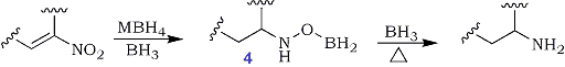 A number of reagents have been used to affect nitroalkene to nitroalkane transformations18. Generally there is loss of product due to dimerization caused by the addition of the nitronate intermediate to another molecule of nitroalkene (via a Michael addition). During our studies, we discovered that the reduction of α,β-unsaturated nitroalkenes by boranes produced high yields of hydroxylamines9; presumably formed via the nitronate intermediate, 1 (Eq 2).