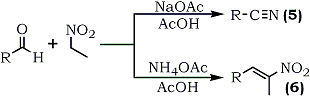 [However, this unusual change of reaction pathway was not observed when nitromethane was used; the products were only 1-aryl-2-nitroethylenes even when sodium acetate was employed]. The generation of ethanehydroxamic acid from nitroethane could convert the aldehyde into an oxime derivative, which in turn could be cleaved to give the nitrile in the presence of sodium acetate. There are reports in the literature in which nitromethane/polyphosphoric acid50, nitromethane/pyridine hydrochloride,51 and nitropropane/ammonium monohydrogen phosphate52 have been used to convert aldehyde to nitriles.