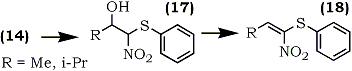 1-Nitro-1-phenylthioalkenes (18) were also recently prepared by condensation of phenylthionitromethane (14) with aldehydes using potassium t-butoxide as a catalyst67 (Eq. 4). The resulting isomeric mixture of nitroalcohols (17) was dehydrated by methanesulfonyl chloride and trimethylamine using Yoshikoshi's procedure.65 Barrett and co-workers have demonstrated the application of (18) in the synthesis of S-phenyl thioesters67 and bicyclic lactams.68
