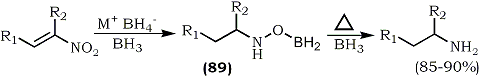 Earlier studies154 demonstrated that hydroxylamines, as well as their precursor oxime derivatives, are reduced by diborane to amines at elevated temperature (105-110°C). Varma and Kabalka12a utilized their earlier reported reaction113 to reduce hydroxylamines (89) to amines. It was found that excess borane reduced the nitroalkenes to amines in the presence of a catalytic amount of sodium borohydride (Eq. 27). The reaction, which generally takes 6 days at room temperature, can be accelerated by running it in refluxing tetrahydrofuran.155 This reduction can also be achieved utilizing in situ generated BH3·THF12 (from sodium borohydride and boron trifluoride etherate). The reaction yields are comparable to those obtained using BH3·THF and the reaction can be carried out in one pot in five hours.