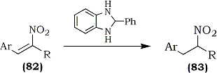 The selective reducing properties of 2-phenylbenzimidazoline (PBI), prepared in situ from o-phenylenediamine and benzaldehyde, was used for reduction of arylnitroalkenes (82) to the corresponding nitroalkanes (70-91%) (83) without side reactions.128 The reaction, however, is not applicable to aliphatic nitroalkenes (Eq. 20).