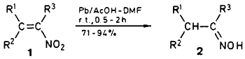 The reduction of 1-nitro-1-alkenes with lead–acetic acid in dimethylformamide afforded the corresponding aldoximes (5 examples) or ketoximes (3 examples) in excellent yield.