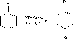 Regioselective Bromination of Aromatics Using KBr/OxoneSynth. Comm. 32(15), 2313-18 (2002)[ Back to the Chemistry Archive ]Halogenated aromatic compounds are a useful class of intermediates as they are precursors to a number of organometallic species useful in the synthesis of natural products and pharmaceutically important compounds. The manufacture of a range of bulk and fine chemicals, including flame retardants, disinfectants and antibacterial and antiviral drugs, involves bromination. (1) Bromo aromatics are widely used as intermediates in the manufacture of pharmaceuticals, agrochemicals and other specialty chemical products. Consequently, a variety of methods for the bromination of aromatics have been reported in the literature. (2-13) Traditional methods of aromatic bromination involve the use of non-selective hazardous acidic reagents such as mineral acids and metal halides, which can lead to separation difficulties and unacceptable levels of toxic and corrosive waste. Conventional bromination methods typically use elemental bromine, a pollutant and a safety and health hazard. To overcome these difficulties some researchers have utilized a combination of hydrobromic acid and suitable oxidant such as tert-butylhydroperoxide or hydrogen peroxide. (13-15) The replacement of such reagents by non-toxic and more selective reagents is very desirable and represents an important goal in the context of clean synthesis. We report a highly para selective method for bromination of aromatic compounds based on the use of KBr as a bromine source and Oxone® as an oxidant (Scheme 1).