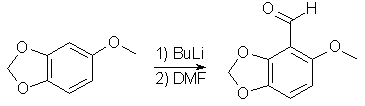 40g 3,4-Methylenedioxyanisole in 300ml absolute THF under argon at -10°C was stirred with 100ml butyl lithium in hexane (1.1 mol) for 2.5h. After the addition of butyl lithium the temperature was slowly raised to room temp. The aryl anion thus formed was stirred with 25ml dry DMF in 100ml THF at 0°C for 10 min, followed by refluxing for 2h. The reaction mixture was then acidified with 6M HCl and extracted with 1500ml ether. Drying over MgSO4 and evaporation of the solvent afforded a pale yellow crystalline compound, mp 124°C. 6-Methoxy-2,3-Methylenedioxyphenol