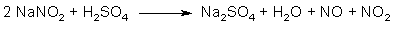 The action of a strong acid (such as sulfuric acid) on sodium nitrite gives the sodium salt of the strong acid, as well as free nitrous acid (HNO2), which in turn breaks down to an equimolar mixture of NO and NO2 gas (see Fig. 2). This gas mixture is in equilibrium with dinitrogen trioxide: N2O3 ←→ NO + NO2