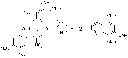 Treatment of the pseudonitrosite dimer with four moles of an inorganic base (such as KOH in alcohol), produces two moles of potassium hyponitrite (K2N2O2) and two moles of the water-soluble potassium salt of the corresponding nitroalkene. Acidification of the potassium salt solution with dilute acid precipitates the water-insoluble phenyl-2-nitropropene as fine crystals, and the liberated hyponitrous acid breaks down into water and nitrous oxide (N2O), which can be observed as fine bubbles that is being evolved during this step.