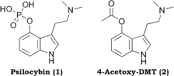As a potential replacement for (1), 4-Acetoxy-N,N-dimethyltryptamine fumarate (2) was conveniently prepared by shaking under hydrogen a mixture of 4, acetic anhydride, and sodium acetate in benzene with Pd/C in a Parr low pressure hydrogenation apparatus. Following uptake of the required amount of hydrogen corresponding to O-debenzylation, the catalyst and insoluble salts were removed by filtration. One molar equivalent of fumaric acid was added to the filtrate, and the solution was concentrated to dryness under vacuum. The resulting solid was recrystallized to afford white crystals of the desired product. This material was stable when stored in the cold, but slowly darkened on storage for several months at ambient temperature.