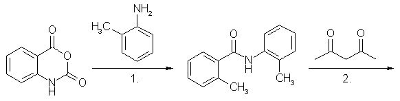 1. Isatoic anhydride condenses with o-Toluidine to give 2,2'-dimethylbenzanilide 2. 2,2'-Dimethylbenzanilide condenses with acetylacetone to form Methaqualone (see structure above) A mixture of 2,2'-dimethylbenzanilide (0.5 g, 0.0025 mole), acetylacetone (0.39g, 0.0025 mol) in ethanol (30 ml) containing a few drops of concentrated hydrochloric acid is refluxed for 1 h. On cooling the title compound separated as the hydrochloride salt: yield: 0,59 g, (85%), m.p. 235-237°. Method B A mixture of 8g isatoic anhydride and 5.5g o-toluidine in toluene (500-750 ml) is refluxed for two hours. Acetylacetone (2.5g) containing a few ml of concentrated hydrochloric acid (to form the hydrochloride) is then added, and refluxing is continued for another hour. Evaporation of the solvent gives methaqualone hydrochloride, which is purified by recrystallization from hot methanol. The yield is 80%. PrecursorsAnthranilic Acid (2-aminobenzoic acid)Method 1: Anthranilic Acid from o-ToluidineN-acetyl-o-Toluidine[4] 50ml o-Toluidine is placed in a 250ml round-bottomed flask containing a few boiling stones, and a reflux condenser is attached. Through an addition funnel placed in a side-arm of the flask, or possibly through the condenser, 50ml of acetic anhydride is added pretty rapidly, and the solution will begin to boil. Maintain the boiling for five minutes with external heating, and quickly pour the reaction contents in a beaker containing 1000ml of cold water. A precipitate of pinkish needles will form, which are filtered off with suction and is purified by dissolving in 25ml of boiling methanol, cooling the solution, and filtering off the beautiful glistening white needles which precipitates. The crystals are air dried, and weighs approximately 50 grams. Do not leave the crystals too long in the air, and keep them in an air-tight container, because they sublime readily at room temperature. N-Acetyl-Anthranilic Acid [7] Dissolve 20 grams of N-acetyl-o-Toluidine and 50 grams of magnesium sulfate in 2500ml water with stirring and heat to 80°C. Add 60 grams of finely powdered potassium permanganate crystals and increase the temperature to 85°C, and continue to stir for 2 hours. Add 50 ml of alcohol to decompose excess permanganate, and filter the solution HOT with suction. The N-Acetyl-Anthranilic Acid is precipitated from the solution with the addition of dilute sulfuric acid. It is purified by dissolving in dilute NaOH solution, and reprecipitating with dilute H2SO4. The yield after air drying is approximately 18 grams. This N-Acetyl-Anthranilic Acid can be molarly substituted for the Anthranilic Acid in the Klosa synthesis above (No 3), with omitting of the acetic acid. Anthranilic Acid [7] 10 grams of N-Acetyl-Anthranilic Acid is added to 100ml concentrated HCl, and boiled under reflux for 1-2 hours. The solution is cooled, and the crystals of anthranilic acid is filtered off and recrystallized from hot water. The approximate yield after air drying is XX g. Method 2: Anthranilic Acid from phtalic anhydride Phtalimide (Method 1) [4] Place 100 g. of phthalic anhydride and 106 ml. of concentrated ammonia in a 1-litre round-bottomed flask fitted with a wide air condenser or a liebig condenser (without cooling water) with an inner diameter of more than 10 mm. Heat first over a wire gauze and then over a free flame until the mixture is in a state of quiet fusion and forms a homogeneous melt (the temperature reaches 300° in about 1.5-2 hours; all the water is evaporated during the first hour). Shake the flask occasionally during the heating and push down any material which sublimes into the condenser with a glass rod. Pour the contents of the flask whilst still hot into a porcelain basin or casserole, allow to cool, and grind to a fine powder in a mortar. The phthalimide (95 g.)is practically pure and melts at 233-234°C. It may be recrystallised from ethanol or methanol (see method B). Phtalimide (Method 2) [4] Intimately mix 99g of pure phthalic anhydride and 20g of urea, and place the mixture in a 1 litre long-necked, round-bottomed flask. Heat the flask in an oil bath at 130-136°C. When the contents have melted, effervescence commences and gradually increases in vigour: after 10-20 minutes, the mixture suddenly froths up to about three times the original volume (this is accompanied by a rise in temperature to 160-160°) and becomes almost solid. Remove the flame from beneath the bath and allow to cool. Add about 80 ml. of water to disintegrate the solid in the flask, filter at the pump, wash with a little water, and then dry at 100°. The yield of phthalimide, m.p. 233° (it is practically pure) is 86 g. If desired, the phthalimide may be recrystallized from 1200 ml. of methylated spirit; the first crop consists of 34 g. of m.p. 234°, but further quantities may be recovered from the mother liquor. Anthranilic Acid (Method 2) [8] Anthranilic Acid from phtalimide, by Methaco(s)mic Anthranilic Acid (Method 2) [4] Prepare a solution of 30 g. of sodium hydroxide in 120 ml. of water in a 360 ml. conical flask and cool to 0° or below in a bath of ice and salt. Add 26.2g (8.4 ml.) of bromine in one portion and shake (or stir) until all the bromine has reacted. The temperature will rise somewhat; cool again to 0° or below. Meanwhile, prepare a solution of 22g. of sodium hydroxide in 80 ml. of water. Add 24 g. of finely- powdered phthalimide in one portion to the cold sodium hypobromite solution; stir vigorously while swirling the contents of the flask and add the prepared sodium hydroxide solution rapidly. The solid will dissolve and the temperature will rise to about 70°. Warm the mixture to 80° for about 2 minutes. Filter, if necessary. Cool in ice and add concentrated hydrochloric acid slowly and with stirring until the solution is just neutral (about 60 ml. are required). [It is recommended that a little of the alkaline solution be set aside in case too much acid is added.] Precipitate the anthranilic acid