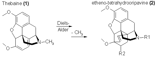 Many of the very effective substitutes for morphine (and to some extent valid as heroin substitutes) are in fact chemically derived from opium alkaloids as a starting material and therefore do not meet these requirements. A large family of synthetic derivatives of thebaine, however, is an exception; although they are dependent upon the P. somniferum for the original starting materials, they are intensely potent in humans. As a consequence of the 10,000x increase of potencies obtainable from such chemical transformations, the manufacture of these drugs as morphine substitutes would be economically feasible in spite of successful restrictions on the importation of the raw chemical materials. One of the principle alkaloids of opium [thebaine, 1, present to approximately 1% in raw opium, and itself a convulsant rather than a narcotic] can be converted through simple chemical modification into chemicals with a new six-ring system that shows extremely high morphinomimetic activity. These compounds, after demethylation to the oripavine analog, can be obtained with wide substitutional variation on either the nitrogen [R1, in 2] or on the new ring generated [vide, R2 in 2].
