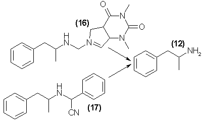 The first of these is illustrated by fenethylline [Captagon, 16], which was first prepared some 10 years ago, and is now easily available in Europe as a nonprescription analeptic agent. It is apparently cleaved metabolically in humans into theophylline (a weak stimulant closely related to caffeine) and amphetamine, and it has been shown that the action of the parent drug may be correlated to the production of amphetamine in vivo48. If this form of metabolic cleavage proves to be general, then any of a large number of stimulants can masquerade as covalently complexed materials that are physiologically available only through metabolic conversion.