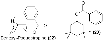 It seems reasonable to anticipate that as more synthetic attention is directed toward this family of stimulants, more easily prepared analogs will be seriously investigated as cocaine substitutes. In the case of cocaine itself, it is known that variations of the carbomethoxy group leads to no dimunition of either anaesthetic or stimulant properties, although most substitution changes on the benzoic acid moiety lessen activity. A similar but chemically more easily accessable molecule is represented by benzoyl-pseudotropine (22), also a component of Erythroxylon coca64 and also known to be centrally active. Care must be shown in classifying these compounds. The pseudotropeines are esters with configuration shown for 22. These only are the stimulants and anaesthetics. The reversed stereoconfiguration of the eater group (the OCOR on the side of the piperidine ring opposite the N-CHa rather than on the same side) leads to the normal tropine series as found in the natural alkaloid atropine and in several clinically valuable synthetic drugs such as benztropin. This latter family is largely parasympatholytic rather than sympathomimetic, and its future abuse potential is discussed in the section on hallucinogens.