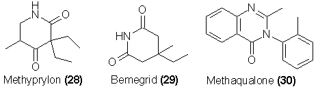 There are at least two future problems that can be foreseen in this area. The first is that these materials, having been classified as substances other than barbituric acid derivatives (and properly so), establish the precedent that any homologs and analogs of these classes may be considered as being outside the blanket description of "barbiturates." There are literally dozens of rather easily synthesized analogs of both 27 and 28 that are established pharmacologically as depressants, and that are not controllable as a family (barbiturates) or as specific drugs (only gluthetimide and methyprylon are named). A second problem lies fallow in the literature, and it will take only a single devoted and industrious chemist to reveal it to the drug subculture. It has been evident for many years that there is a close interrelationship between anticonvulsant and convulsant activity, and between sedative and stimulant activity. Within all of these families, it is a consistent observation that if one extends the alkyl chains, or if one adds increasing N-alkyl substitution, one tends to generate activity out of inactivity, or to shift from a quieting of the CNS to the stimulation of it. Yet another structural rearrangement is known that similarly could be a starting point for a family of abuse drugs. If the alpha,alpha dialkyl groups of glutethimide are translocated to the beta-beta-corresponding positions, one can find an entirely new family of drugs, those related to the commercial compound Bemegrid (29). This latter material is a CNS stimulant, and it is reasonable to expect that many of the possible analogs of this simple compound will be pharmacologically equivalent, differing only in the dosage required for effective activity.