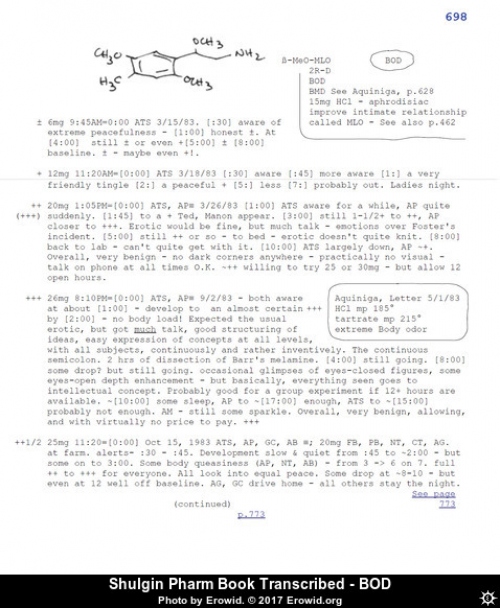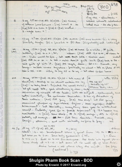 After that, the lab notebook transcribing project was mine -- I am still working on it today. It's hard to attract additional volunteers for this task due to its tedious nature, which even to a Shulginophile drug geek is more monotonous than you might imagine. A labour of love for sure! Sometimes I wonder if the only reason I make progress is out of sheer stubbornness. The number of hours I've poured into these notebooks is greater than I'd like to admit, but I feel I've created something that will provide lasting value to curious seekers in the future. Even if all that comes of it is a permanent online record of Sasha's work, it will have been worth every minute.