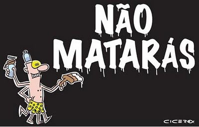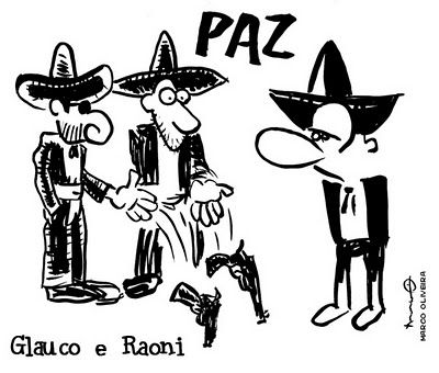 The characters called Três Amigos (Three Friends) showed Glauco and his friends and fellow cartoonists Angeli and Laerte in the guise of Mexican bandits. Here the latter two drop their guns before Glauco, with the word "Peace" above them. Underneath, the names of Glauco and his son Raoni. |