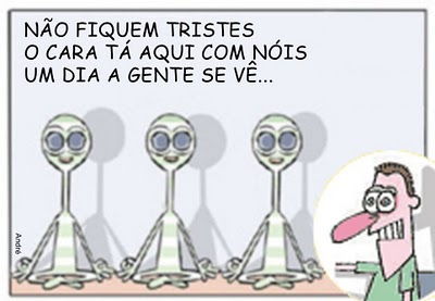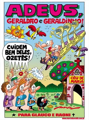 Under the heading "Goodbye, Geraldão and Geraldinho!", Glauco's characters cry out: "Take good care of them, E.T.s!", in front of Glauco's SantoDaime church, Céu de Maria. |