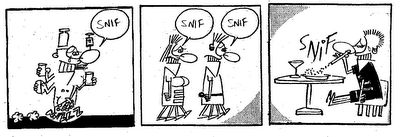 First comes Geraldão. Then, three more of Glauco's characters, Casal Neuras ("The Neurotic Couple", a hilarious case of pathological jealousy) and Doy Jorge, a drug addict. So, the word "sniff" means both crying and snorting cocaine. |