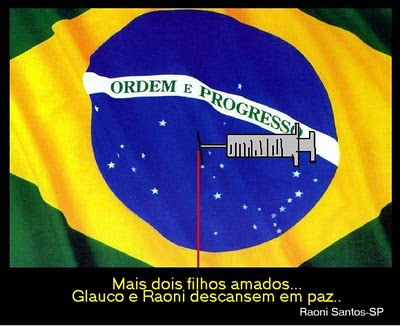 "Two more beloved sons... Glauco and Raoni rest in peace", says this cartoonist. The Brazilian flag, with its "Order and Progress" motto, is pierced by a syringe, of the kind Geraldão used. |