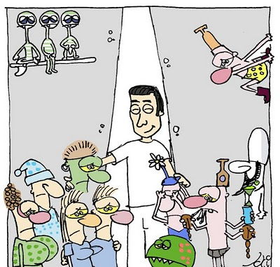The creatures with the creator. The three surfing E.T.s are high above, and below, from the left: Dona Marta (a sex-starved secretary), Netão (an internet addict), Doy Jorge (with the green skin), the Neuras Couple together with their little green Monster of Jealousy, Apocalypse Joe, Geraldão and Nojinsk (an eccentric and always silent Arab). Geraldinho, the child version of Geraldão, clings to the wall. |