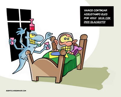 Geraldão's ghost appears by the bedside of Brazilian president Lula. "We'll keep scaring them for you! Go with God, Glauquito" ("Little Glauco" in Spanish, as he was often called.) |