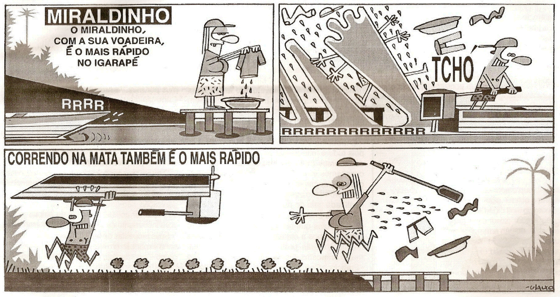 Here we present one cartoon where the character "Miraldinho" appears. "Miraldinho" was specifically created by Glauco for a community newspaper, briefly published at Céu do Mapiá, Santo Daime's headquarters in the Amazon, to which Glauco's church was affiliated. Glauco had already created Geraldinho ("Little Gerald", a typical big city kid, addicted to TV, soda pop, hotdogs and ice creams) as a juvenile version of his main character, Geraldão ("Big Gerald") -- so Miraldinho can be seen as a Santo Daime version of Geraldinho. His name is a play on the word "miração", which, while seldom heard in Brazil, is commonly used in the Brazilian ayahuasca churches Santo Daime, UDV and Barquinha. In broad terms, it means "to be under the effect of ayahuasca" and its more specific meaning is "to have an ayahuasca vision". This character did not have a long life or defined personality; he only appeared a few times. In this comic strip Miraldinho is at an "igarapé", a small jungle stream typical of the region in and around Céu do Mapiá . One usually reaches the community by river and there, as in other Amazon villages, the river is also the place where the local people wash dishes and clothes, bathe and have social gatherings, etc.