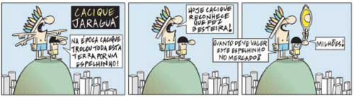 It is worth noticing that Jaraguá ("Lord of the Valley" in the indigenous Tupi language) is the name of the mountain close to Céu de Maria (Pico do Jaraguá, [Jaraguá Peak]), which dominates all the surrounding scenery, above the sprawling city skyline. In Cacique Jaraguá's comic strips, Glauco always made puns with the names of São Paulo's districts and neighborhoods, turning them into different tribes -- with a kind of humor that people who are not familiar with the city will probably find hard to understand.