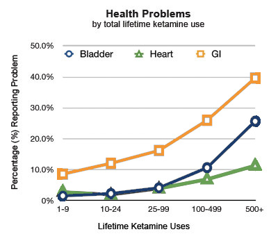 There was a clear correlation between total lifetime use of ketamine and likelihood of reporting bladder/urinary problems: 1.6% of those who report 1-9 uses in their lifetime, 2.3% with 10-24 uses, 4.1% with 25-99 uses, 10.6% with 100-499 uses, and 25.7% of those reporting 500 or more uses of ketamine. All medical problems were more likely to be reported with higher total lifetime use. Neither medical problems nor total lifetime use was correlated with age.