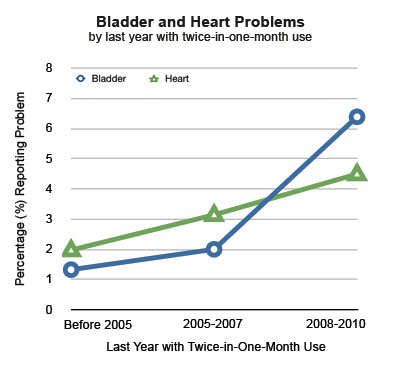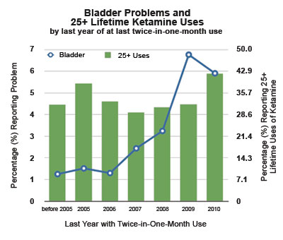 People who had used ketamine more recently were much more likely to report health problems. Ketamine-caused bladder or urinary problems were reported by 1.3% of those whose last year with two or more ketamine uses in a single month was before 2005. 6.4% reported bladder problems if they last used ketamine at least twice in one month after 2007.