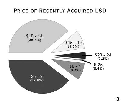 In the second of these surveys, 78.5% of those who had recently acquired LSD reported paying between $5 and $14 per "dose or hit". Only 3.8% paid more than $20 and 8.3% reported paid less than $5 per "hit". Prices remained very consistent in the three months between surveys, with a slight trend towards lower prices.