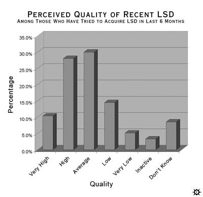 Requesting information about the quality of a street drug such as LSD can be problematic, as differentiating between quality/purity and dosage per hit can be nearly impossible. A low dose of LSD may often be reported as "poor quality" when the material may actually be of high quality, just low dosage. Very simply, dosage and quality/purity are largely inseparable when discussing the street use of acid. Therefore, we assume that these two factors are combined in the following answers.