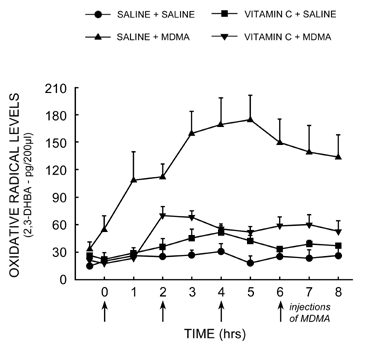Figure 1. Effects of MDMA on the extracellular concentration of the free radical 2,3-DHBA in rats. The upper line shows that levels of 2,3-DHBA are highest in rats given MDMA without Vitamin C. In comparison, the line with the downward pointing triangles shows levels of 2,3-DHBA in rats given both vitamin C and MDMA. Lines marked with circles and squares show levels in control rats not given MDMA. (graph from Shankaran 2001)