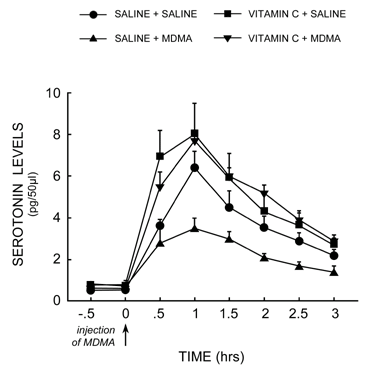 Figure 2. Effects of MDMA on serotonin levels in rats. The bottom line shows that levels are lowest in rats given MDMA without Vitamin C one week earlier. In comparison, the line with downward pointing triangles shows levels of serotonin in rats given both Vitamin C and MDMA one week earlier. Lines marked with circles and squares show levels in control rats not given MDMA the week before. (graph from Shankaran 2001)