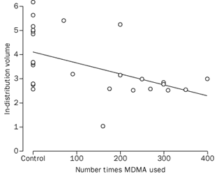 2. The computed correlation (0.50) may be misleading because of the intentional inclusion of a large number of control subjects (zeroes on the horizontal axis). It is generally unwise to choose subjects for a correlational analysis on the basis of their scores on one of the variables in the correlation: in this case selecting people who have a score of 0 on the "number of MDMA uses". Generally speaking, it is difficult to interpret the meaning of correlations computed in these kinds of studies.