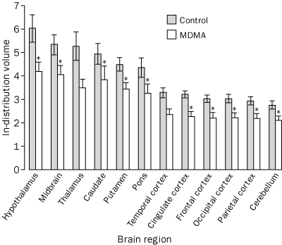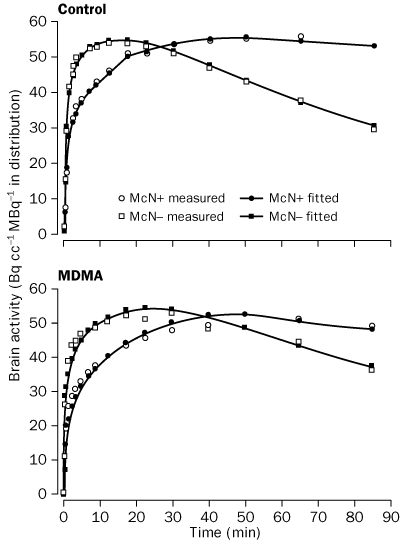 We used logarithmic transforms of DVs corrected for non-specific binding to achieve a normal distribution in the control and MDMA groups, and to enable analysis of variance. Logarithmic transformation across all regions in participants in the control group resulted in a pooled coefficient of variation of 22%.