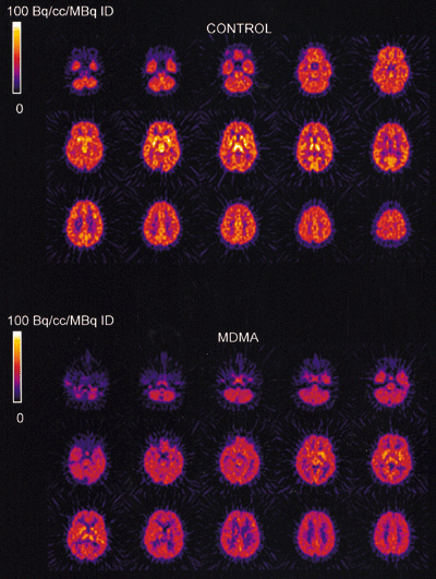 A potential drawback of our study is that we relied upon participants' reports of drug use and duration of abstinence. This is an inherent problem in all studies of illicit drug use. Our participants are unlikely, however, to have altered their drug-use history because they contacted us and identified themselves as MDMA users. Drug tests indicated that no participant used marijuana in the 2-3 weeks before the study, despite several participants being regular marijuana users. Participants were told that they would undergo drug testing at the time of admission to the study, and that they would not receive payment if they had positive results for psychoactive drugs. Knowledge of drug testing upon arrival was probably a good deterrent from drug use, and because participants underwent PET scans 48 h after drug testing, we can be certain that participants abstained from amphetamines for 4 days before PET imaging. In future studies, hair-sample analysis would be a more useful way to ascertain long periods of abstinence from MDMA.