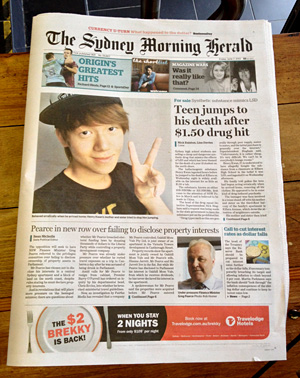 In early June 2013, Henry Kwan took something he believed was LSD and later jumped to his death from a third floor balcony in Sydney, Australia. Two newspapers carried it as front page stories the next day, with one proclaiming "boy "'thought he could fly'", in clear reference to past media treatments of LSD-related deaths. Both papers indicated LSD was not likely involved, with the Sydney Morning Herald stating it was either 25B- or 25I-NBOMe.
